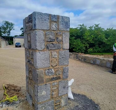 A durable, mixed-masonry pillar built with dressed gray sandstone (ashlar) blocks and smaller, dark rubble. It features thick mortar joints for a rustic aesthetic and is used as a substantial gate post or property entrance feature.