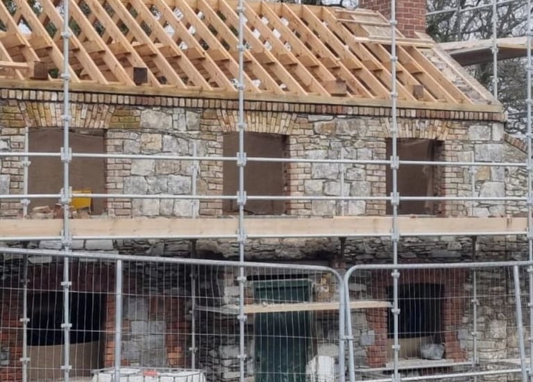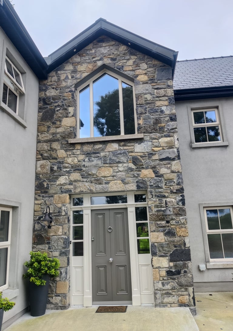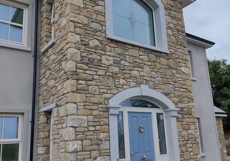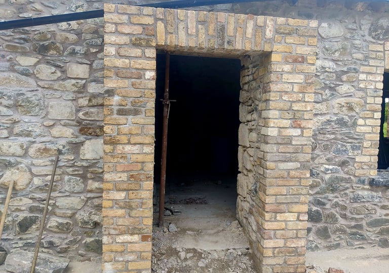 Blending Materials for Timeless Appeal. Witness the beautiful effect of combining rugged stone with detailed brickwork (likely reclaimed/yellow brick). This mix creates character-rich facades, adding depth and authenticity to any home or structure.